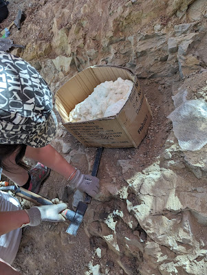 - Los trabajos realizados han exigido un esfuerzo intenso y prolongado, al tener que retirar una gran cantidad de sedimentos y roca situados encima de los niveles donde se localizan los fósiles. Esta situación ha requerido de varios días de eliminación y extracción de toneladas de tierra, reduciendo el número de días de trabajo con los fósiles hallados. Aún así, los resultados han compensado la dureza de las tareas previas.